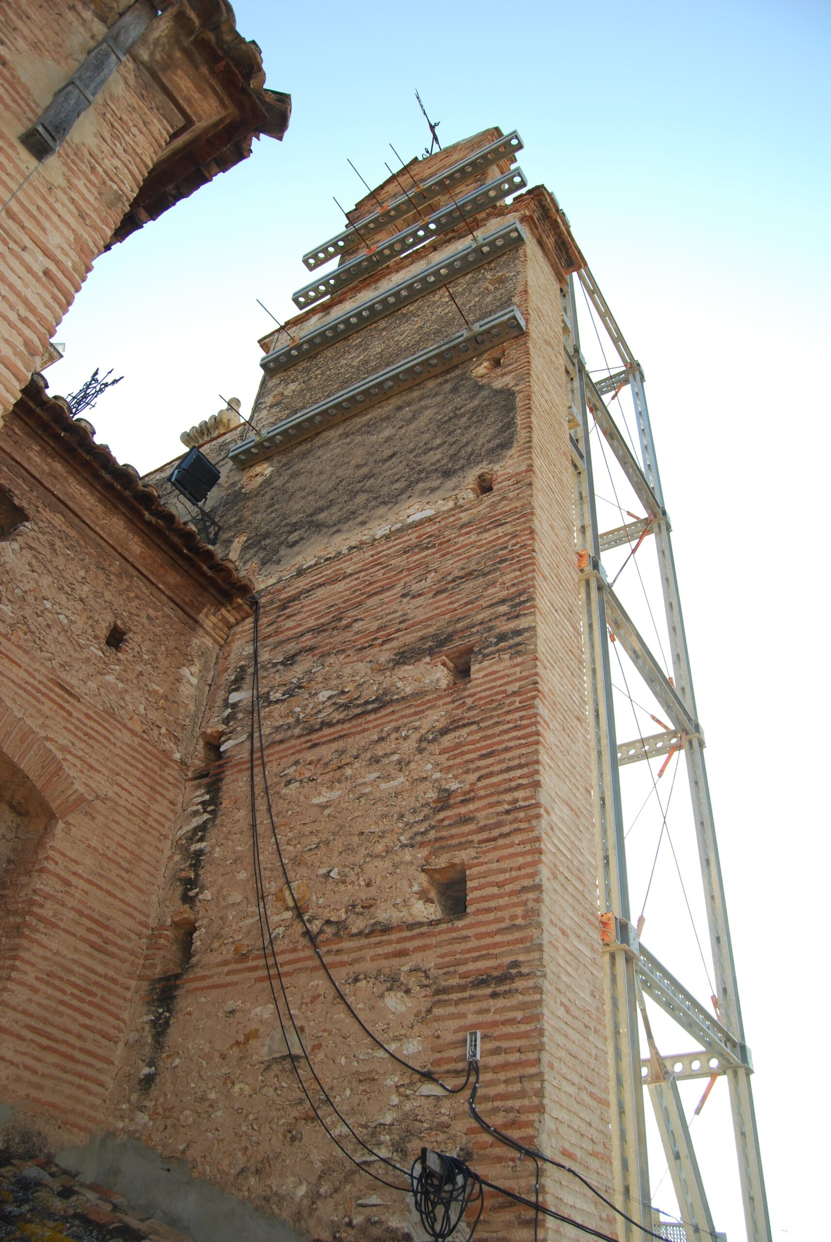 Fachada principal y espadaña estaban apuntalados mediante un estabilizador. La solución debía ejecutarse con la mayor economía de medios.