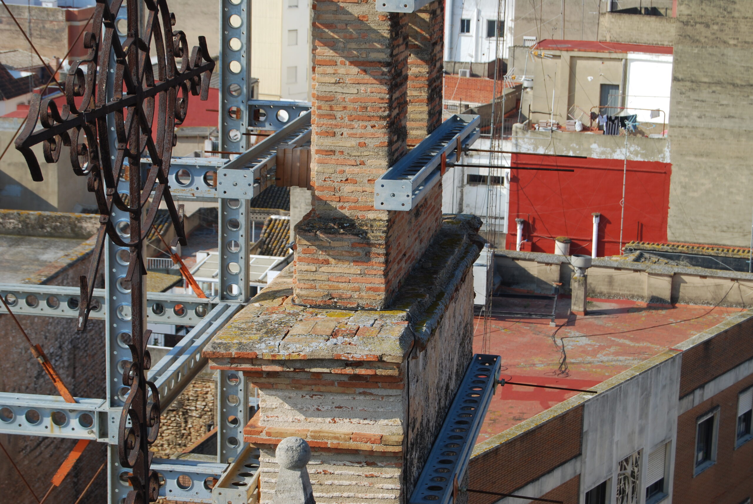 Una viga en bóveda y unos conectores a la fachada principal junto con unos tirantes anclados en los contrafuertes constituyó la creativa solución.