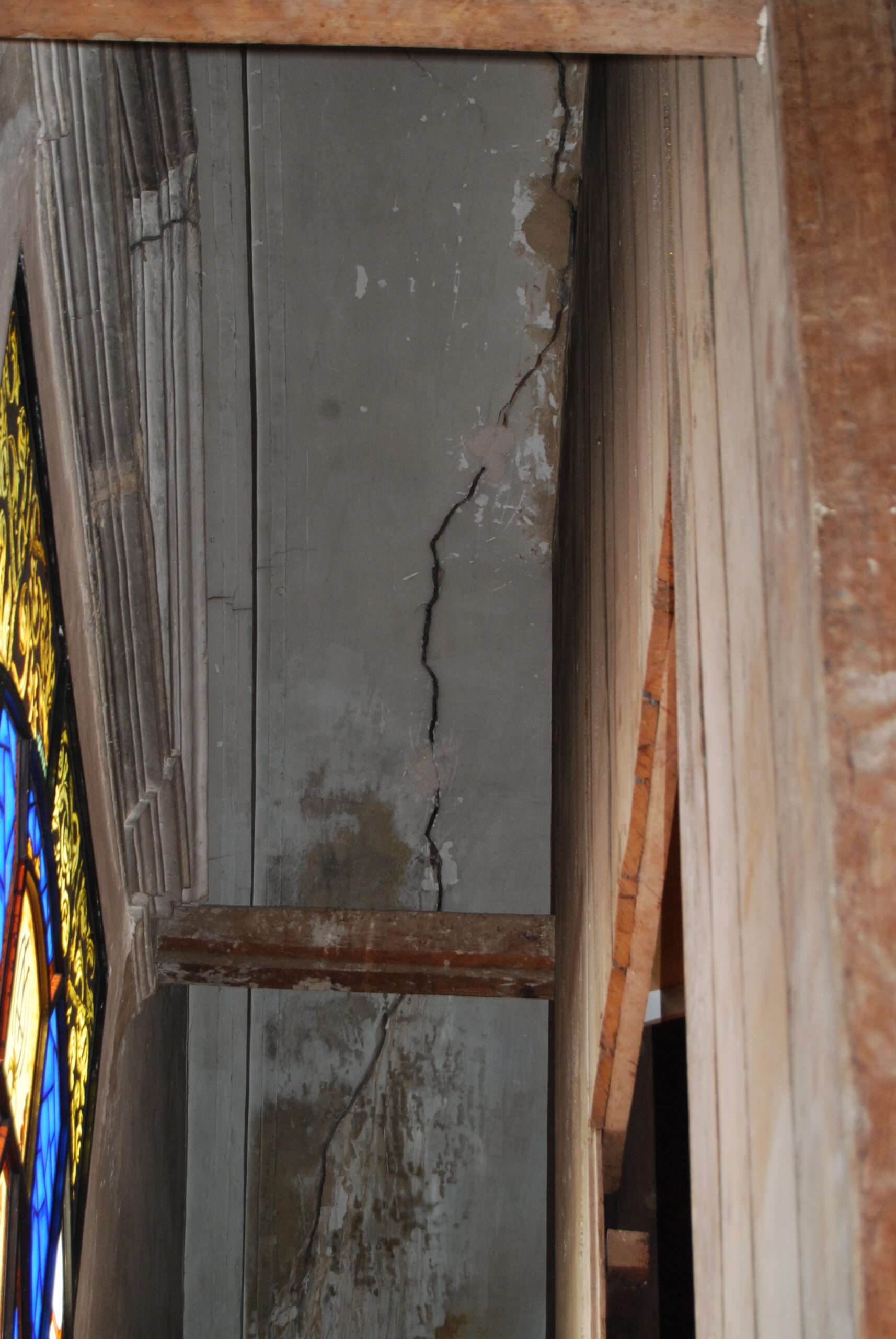 El viento combinado con la baja resistencia a tracción del material de la estructura resultó el agente principal provocador de la grieta en la bóveda y la separación por rotura entre fachada lateral y extremo oeste de la fachada principal. Al mismo efecto colaboraría las pequeñas acciones sísmicas a lo largo de los tres siglos desde su construcción.
